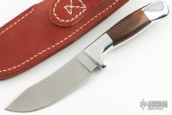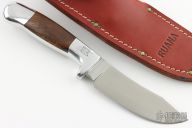 This 95MP skinner by Ruana has a satin finished flat ground blade with .178" blade stock and 1.167" blade depth, hidden tang construction. The handle has a cast aluminum handle with ironwood inserts. Comes with leather sheath. Excellent Condition.