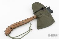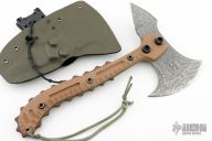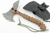 This tactical Hatchet by James Coogler features a stonewashed and acid etched blade with sharpened rear blade, .671" blade stock. The handle has brown G-10 scales with a black/brown G-10 "tang". Comes with a kydex sheath. The center black/brown G-10 tang is a little loose, otherwise excellent condition.
