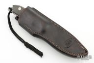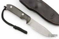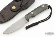This War Eagle by Zack Knives features a clip point blade with bead blasted finish and notched thumbrest, .188" blade stock, 1.192" blade depth, full tang construction. The handle has black linen micarta scales with red liners. Includes a black leather sheath. Has a couple light scuffs, otherwise excellent condition. Comes with a zippered case.