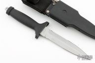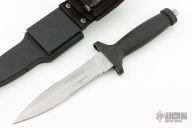 This is a Gerber TAC II Military Survival Knife with the locking sheath. The blade is double edged and double serrated. Blade is .146" thick and 1.117" in depth. Blackie Collins is the designer. The handles on TAC IIs are molded Zytel, full-hidden-tang. Comes with original locking sheath. Serial #A05068. Has some light scratches on the blade, otherwise excellent condition.