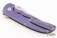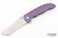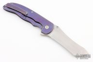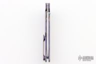 This Norseman (#6311) by John Grimsmo features a stonewashed blade with single thumbstud, notched thumb ramp and flipper. The handle features anodized finished and crosshatch textured titanium frame with titanium screws. Very smooth action that requires no wrist movement. Nice detent, lockup and blade seating. Rides on ceramic bearings. Comes with original custom hard case, Nano-Oil, tool, and COA dated September 7, 2022. Has some scratches, otherwise excellent condition.