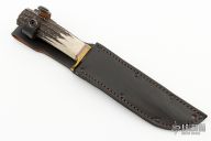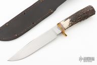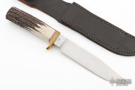 This custom hunter by Master Smith Donald Lange has a hand rub satin finished clip point blade with .208" blade stock and 1.251" depth, hidden tang construction. Handle has an engraved brass guard and stag grip with red/white/black/brass spacers. Comes with a black leather sehath and a zippered case. Excellent condition.