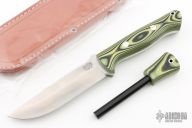 This Bravo-1.25 by Bark River Knives features a satin finished blade with notched thumbrest, .223" blade and 1.163" blade depth, full tang construction. The handle has bumblebee G-10 scales with aluminum pins. Comes with a brown leather sheath and original box. Excellent condition. Comes with matching fire steel.