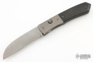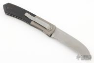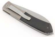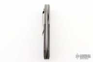 This model 5 by Kit Carson features a bead blasted wharncliffe style blade with partial serrations. The blade is .125" thick and .935" blade depth. The handle is .5" thick not including the clip and .663" thick including the clip. The handle has bead blast finished titanium bolsters, kydex scales, bead blasted titanium liners.  Marked Numbered 004.  Tip down bead blasted stainless clip. Has a coupld light scuffs and a nick in one of the liners, otherwise excellent condition.