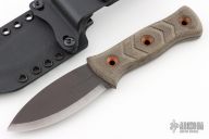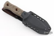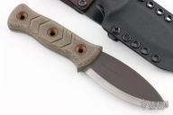 This MSK by Dave Wenger features a black Caswell finished blade, .113" blade stock and 1.360" blade depth, full tang construction. The handle has green canvas micarta scales with brass tubes. Comes with a kydex sheath with leather belt loop. Excellent condition. Comes with a COA dated 7-5-23