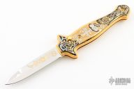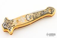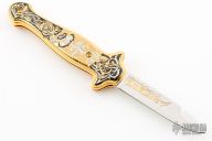 This beautiful Gold SOPHY is a great collaboration between AGA Campolin and knifemaker Dmitry Chertov from Zlatoust, Russia. The blade on this coil spring automatic switchblade is made of 40Х10С2М steel and the handle is gold plated with a beautiful design. This is a limited edition. Excellent condition.