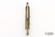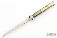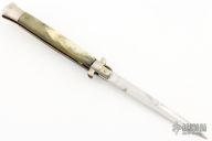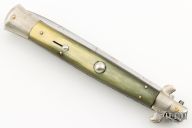 This pick lock auto by Latama is vintage. It features a bayonet ground blade with a false top edge. The handle has nickel silver guard and rear bolster and buffalo horn scales, D-Stamped brass liners, steel backspacer with round lock tab. Has nickel silver button and safety. Has scratches and a little patina, otherwise good condition for its age.
