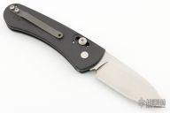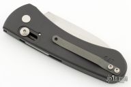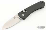 This side opening auto by Rob Dalton features a drop point bead blast blade. The handle has an aluminum frame with thumb-slide opener, tip up bead bladed titanium clip, right or left reversible. #179 on back of handle. Excellent condition.