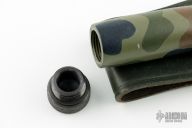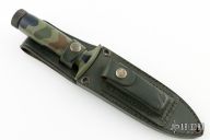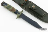 This Survival Bowie by Valor features a black coated blade with sawteeth on the spine, .157" blade stock and 1.013" blade depth, hollow handle construction. The handle is camo coated aluminum with a knurled steel butt cap. Coems with a black leather sheath with sharpening stone. Has some scratches and wear on the coatings, otherwise excellent condition for its age.
