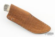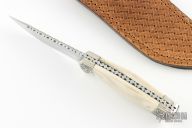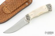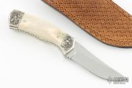 This knife by Don Byrd features a satin finished blade with fileworked spine, .125" blade stock and .889" blade depth, full tang construction. Engraved nickel silver bolsters, smooth stag scales with a fileworked tang. Comes with a brown leather sheath. Excellent condition.
