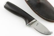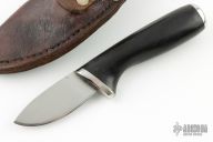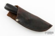 This Knife by Steve Brooks features a satin finished blade with .108" blade stock and .961" blade depth, hidden tang construction. The handle is comprised of a steel guard and butt with a wood grip. Includes leather sheath with belt loop. Excellent condition.