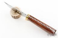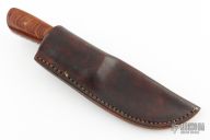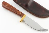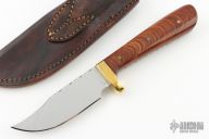 This knife features a mirror polished blade with false top edge and fileworked spine, .147" blade stock and 1.239" blade depth, full tang construction. The handle has a brass guard with dymond wood scales and brass and mosaic pins. Fileworked tang. Comes with a brown leather sheath. Excellent condition.