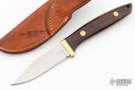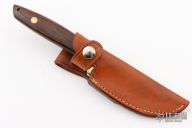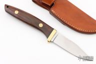 This knife by LC Smith features a satin finished blade with notched thumbrest, .135" blade stock and .984" blade depth, full tang construction. The handle has a brass guard, cocobolo scales with a black spacer. Comes with a brown leather sheath. Excellent condition.
