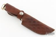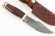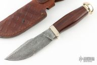 This knife features a Damascus blade with false top edge and notched thumbrest, .190" blade stock and 1.388" blade depth, hidden tang construction. The handle has a nickel silver guard and butt with rosewood grip. Comes with a tooled brown leather sheath. Has a few light scratches, otherwise excellent condition.