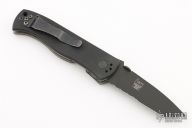 This CQC-7 by Emerson Knives has a tanto chisel ground tanto blade with notched thumbrest, wave features and a single thumbstud. The handle has G-10 scales, titanium liners, barrel spacers, and a tip up black stainless clip.  Nice detent, lockup and blade seating.   Light scuffs/scratches are visible on the blade and handle otherwise the knife is in excellent condition.