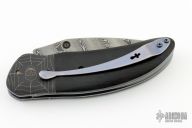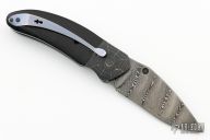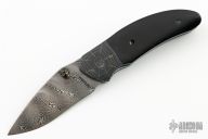 This folder by Peter Martin features a Damascus drop point blade with a skull thumb stud.  The handle features mosaic Damascus bolsters, bog oak scales over titanium liners and an anodized titanium tip up pocket clip. Comes with a zipper case. Light oxidation is visible on the blade.  Light scuffs and scratches are visible on the blade and frame otherwise the knife is in good condition.