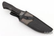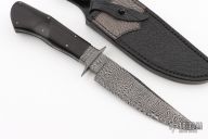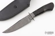 This Integral Hunter by Master Smith Michael Quesenberry features a Damascus blade with a nearly sharpened top edge, .184" blade stock and 1.375" blade depth, integral full tapered tang construction. The handle has an integral Damascus guard with African Blackwood scales with heirloom fit up. Comes with a black leather sheath by Paul Long. This knife wears his Journeyman Smith stamp. Excellent condition. Stunning piece.