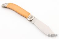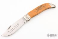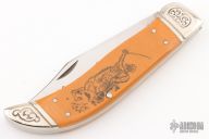 This knife by Schrade Cutlery was made to commemorate our 26th President, Theodore Roosevelt. It features a satin finished blade with nail nick. The handle has engraved nickel silver bolsters and liners, yellow paper micarta covers with scrimshaw, stainless spring. Excellent condition.