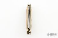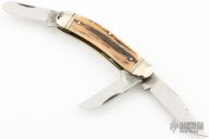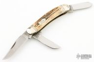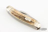 This slipjoint by Rigid Knives features mirror finished blades with nail nicks. The handle has nickel silver bolsters, stag covers, brass liners and steel springs. Has some light scratches, otherwise excellent condition.