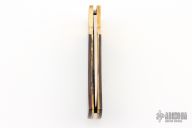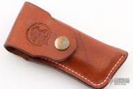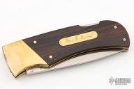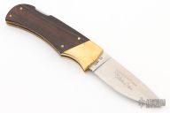 This vintage lockback by Benchmark features a satin finished blade. The handle has brass bolsters with integral liners, cocobolo scales with a brass escutcheon. Comes with a brown leather. Has some patina, otherwise excellent condition. The escutcheon is engraved with "John D. Szakal"