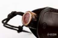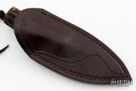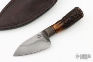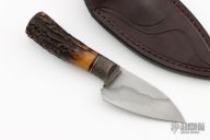 This EDC Knife by Mariano Yannoni features a 1095 blade with nice hamon, .136" blade stock and 1.34" blade depth, hidden tang construction. The handle has a textured brass guard and a sambar stag grip, copper spacer, and inlaid epoxy on the butt. Comes with a brown leather sheath, COA and leather case. New from maker!