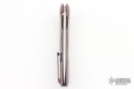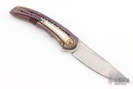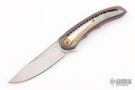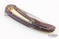 This Voyager by LesBar Knives features a hand rub satin finished blade with notched flipper and a bead blasted fuller. The handle has a milled and anodized titanium frame with Crystallized titanium and gold lip pearl inlays, nicely milled and anodized titanium backspacer with lanyard hole, tip up anodized titanium clip with ceramic ball and hidden screws. Has a stainless steel lockface insert. Has a "vented" frame that you can see all the way through. Rides on "In-House Made" ceramic ball bearings and has "In-House Made" screws and pivot. Nice detent, lockup and blade seating. Comes with original box and COA #9 of 33. New from maker!