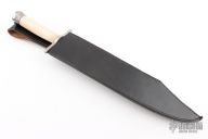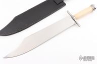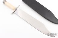 This bowie by Windless Steelcrafts features a satin finished blade with .174" blade stock and 2.422" blade depth, hidden tang construction. The handle has a stainless steel guard and butt with bone grip. Comes with a black leather sheath. Has some scratches and some oxidation, otherwise good condition.