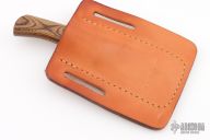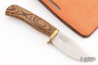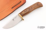 This knife from Blackjack Knives features a satin finish clip point blade with false top edge, .205" blade stock and 1.081" blade depth, hidden tang construction. The handle is comprised of a brass guard a wood. Includes a brown leather sheath and original box. Excellent condition.
