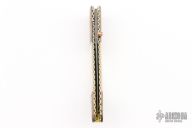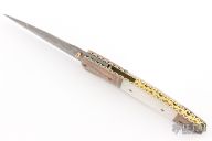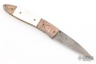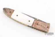 This linerlock folder by Charles H Morris features a Damascus blade with a false top edge and single gold thumbstud with .05ct Diamond inlay. The handle has fluted mokume bolsters, checkered mother of pearl  scales, anodized and fileworked titanium liners and backspacer. Has nice detent, lockup and blade seating. Excellent condition. Comes with a zippered case.