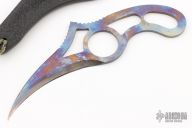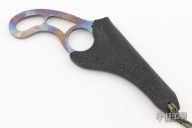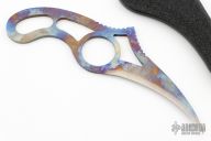 This knife by Aaron Harris features an anodized titanium chisel ground blade with noctched thumbrest and skeletonized tang, .121" blade stock and 1" blade depth, full tang construction. Comes with a kydex neck sheath. Has a few scratches, otherwise excellent condition.