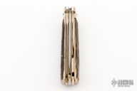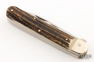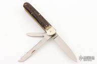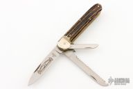 This knife by Hubertus is unique, it features three satin finished blades. The center blade is an auto and is fired by pressing down on the back of the small blade, the third blade is a saw blade with a bottle opener. The handle has nickel silver bolsters, stag scales, brass liners and steel springs. Has some patina and light scratches, otherwise excellent condition.