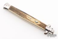 This 13" Swivel Bolster features a polished ground blade with false top edge. The handle has stainless steel bolsters, front and rear, stag scales, brass liners, stainless spring. Has some some scratches, otherwise excellent condition.