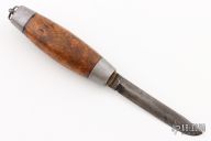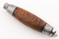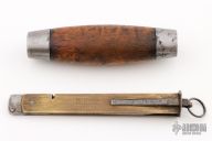 This Barrel Knife by Segerstrom features a clip point blade. The blade sets in a brass frame that holds the blade in the open and closed positions. The handle has steel bolsters with a wood grip. Has scrathces and patina, otherwise good condition for its age.