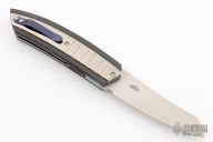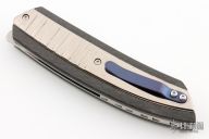 Polished titanium onlays on the AM5 run the full length of the frame and perfectly set off the carbon fiber. Beveling along the edges of the handle scales reveal the lower texture of the carbon, providing three contrasting patterns to feast your eyes on while holding the knife.