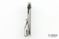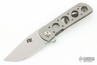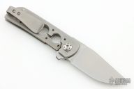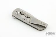 This Framelock flipper from Brad Zinker features a stonewashed blade with checkered thumbrest and flipper. The handle has a stonewashed titanium frame with matching tip up clip. Nice detent, lockup and blade seating, rides on bearings. Includes a padded zippered case. New from maker at the 2023 NCKS.