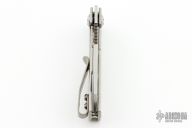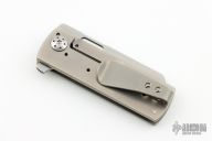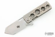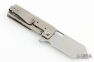 This Mini Tanto Money Clip Flipper by Brad Zinker features a stonewash finished blade with notched thumbrest and flipper. The handle has a stonewashed titanium frame with a matching tip up clip. Rides on bearings, nice detent, lockup and blade seating. Comes with a zippered case. New from maker at the 2023 NCKS.