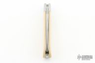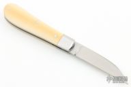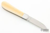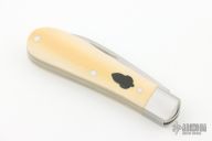 This Swayback from Bill Ruple features a hand rub satin finished blade with nail nick. The handle has polished stainless steel bolsters, antique Westinghouse paper micarta covers with a black paper micarta acorn escutcheon, stainless steel liners and spring. Half stop. Great blade seating. Comes with zipper case. New from maker at the 2023 NCKS.
