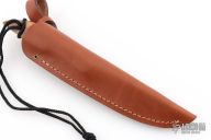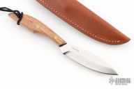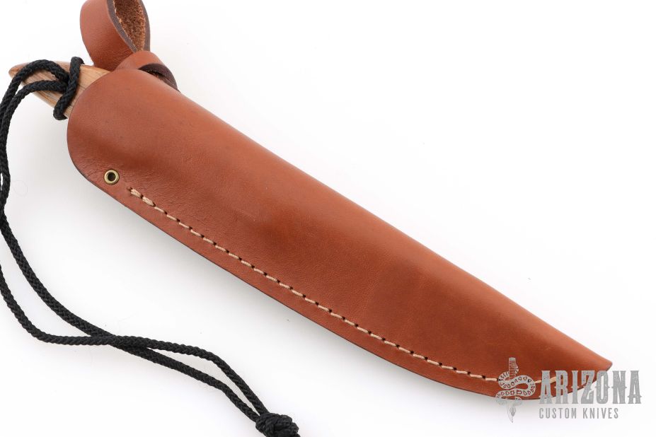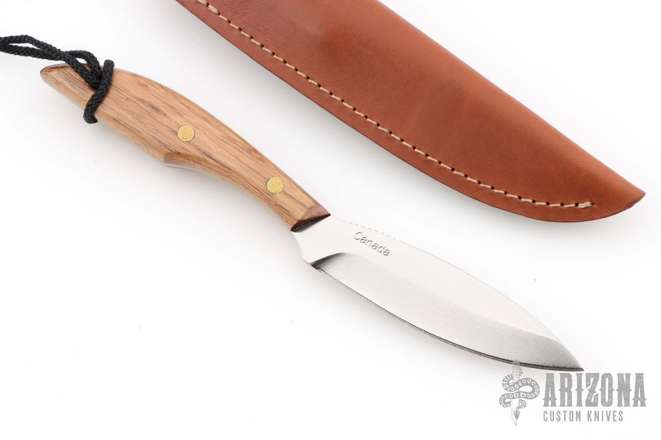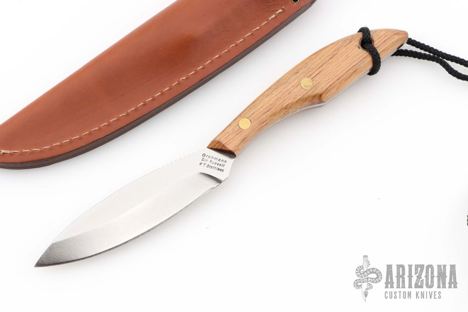 The belt Knife, by Grohmann Knives, features an upswept drop point blade with a notched thumb rest and a full tang construction. .105" Blade Stock .795" Blade Depth. The handle is composed of wood scales. Includes a brown leather sheath. Excellent Condition.
