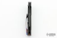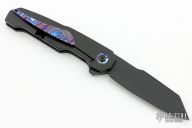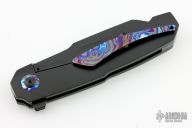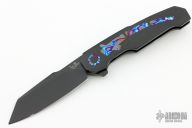 This Boudicca by Anton van der Westhuizen features a black cerakoted blade with a thumbhole. The handle has a black cerakoted titanium frame with black timascus inlays, pivot collar, backspacer and tip up clip. Rides on ceramic IKBS, nice detent, lockup and blade seating. Has concealed hardware and overtravel stop. Comes with original zippered case and COA dated 2024. New from maker.