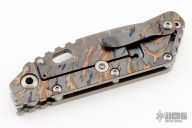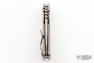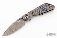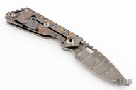 This SMF by Mick Strider features a laser engraved blade with thumbhole and notched thumbrest. The handle has laser engraved titanium frame and tip up titanium clip.  Notches on thumbrest, rear of handle. Nice detent, blade seating and lockup. New condition. Comes with a velcro case.