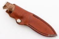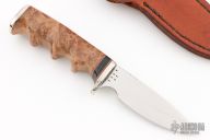 This knife by Gorden Johnson features a mirror polished blade with fileworked spine, .156" blade stock and 1.068" blade depth, hidden tang construction. The handle has a nickel silver guard, maple burl grip with red/white/black spacers. Excellent condition. #2008 and "07" on the blade. Comes with brown leather sheath.