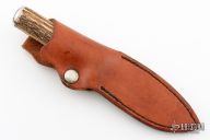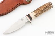 This knife by Gorden Johnson features a mirror polished blade with fileworked spine, .159" blade stock and 1.049" blade depth, hidden tang construction. The handle has a nickel silver guard and butt, stag grip with red/white/black spacers. Excellent condition. 2008 and 08 on the blade. Comes with brown leather sheath.