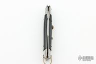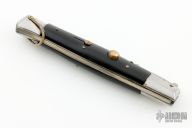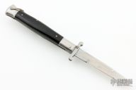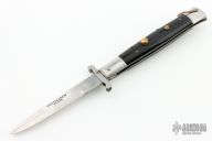 This Swing Guard Stiletto Auto has a mirror polished stainless steel spear point blade with false top edge. The handle has black acrylic scales with stainless steel bolsters and liners, nickel silver auto button and safety button, and brass bail. Rust is visible on the backspring and lanyard bail. Has scratches and scuffs, has some blade play, otherwise fair condition.