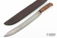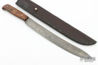This Butcher Camp knife by Wayne Goddard features a Cable Damascus blade with full tapered tang construction. The blade is .187" thick with 1.395" depth. Handle has walnut scales with steel pins. Comes with original sheath. Excellent condition.