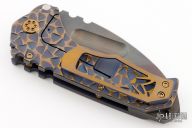 This Praetorian Ti by Medford Knife and Tool features a vulcan finished drop point blade with fullers and notched thumbrest. The handle is comprised of an anodized and tectured titanium frame over a steel backspacer/glass breaker. The tumbled titanium pocket clip is positioned for right hand, tip up carry. 303-584 inside the frame. Includes original box, COA and case. Excellent condition.