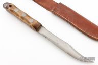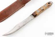The Vintage Model 9 by John Ek has a maple scales with poured lead rivets. Satin finished Nickle-Chrome Moly Steel blade with full tang construction, has a thickness of .118" and depth of 1". Tang extends 3/4" at the butt with a lanyard hole in the scales.  Includes brown leather sheath. S/N 9I911. Has some patina and scratches, otherwise good condition for its age.