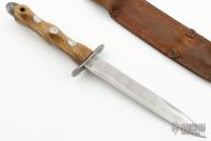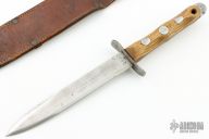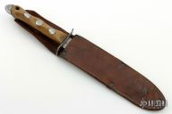 The WWII Model 1 by John Ek in WWII. The handle has Rare oak scales with poured lead rivets. Satin finished Nickle-Chrome Moly Steel blade with full tang construction, has a thickness of .128" and depth of 1 ". Tang extends 3/4" at the butt with a lanyard hole in the scales.  Includes a brown leather sheath. S/N 6G78. Has some patina and scratches, otherwise good condition for its age.