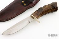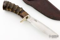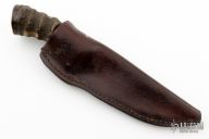 This Hunter by Irvin Campbell features a polished drop point blade with visible temper line, .158" blade stock and 1.208" blade depth, hidden tang construction. The handle has a nickel silver guard and butt, wood and kudu horn grip with red/black spacers. Comes with a brown leather sheath. Has some scratches and patina, otherwise good condition.
