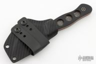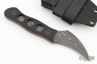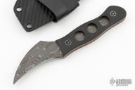 This knife by Jensen Bergman features a chisel ground stainless Virus Damascus blade with thumbramp, .137" bladestock, 1.068" blade depth, full tang construction. The handle has black G10 scales, orange G-10 liners, with portholes. Comes with a kydex sheath and COA. New from maker!