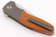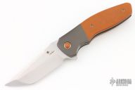 This Korudo Flipper by Kirby Lambert features a hand rub satin finished blade with notched thumbrest and flipper. The handle has zirconium bolsters, vintage Westinghouse paper micarta scales, bead blast finished titanium liners, matching westinghouse backspacer, and a tip up zirconium clip, anodized titanium hardware and micarta inlay on the pivot. Nice detent, lockup and blade seating, rides on bearings. Comes with nylon zippered case and sticker. New from maker!